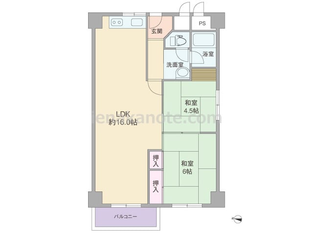 専有面積56.73平米の2LDK。玄関扉は内開きのため玄関スペースは限られますが、防犯面では安心です。LDKは約16.0帖とゆとりがあり、キッチン前の窓は換気がしやすく快適。和室は続き間になっており、引き戸を開放して10.5帖の一室に利用...