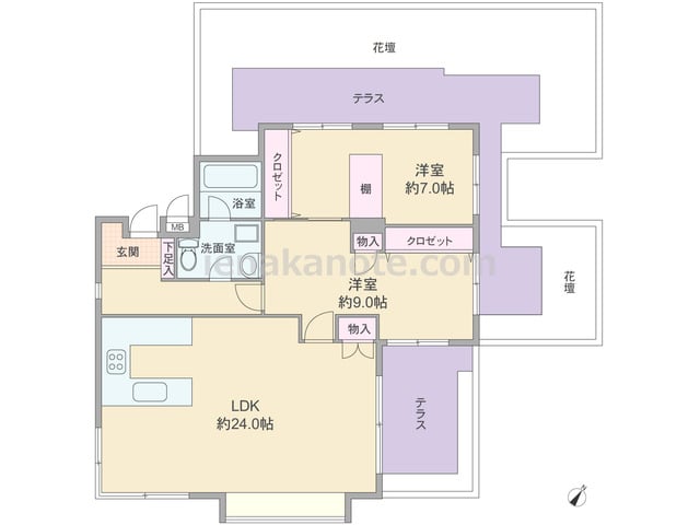 専有面積92.74平米の2LDK。共用廊下に直接面する窓が無く、玄関先から室内を見通せない、プライバシーが確保されたプラン。LDK約24.0帖は三面に窓があり、一部は開放的なコーナーサッシが用いられています。キッチンはコの字型・対面タイプ...