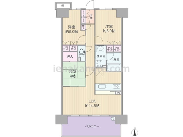 専有面積69.30平米の3LDK。LDKは約13.5帖、キッチンは空間を有効利用できる壁付け・オープンタイプ。主寝室約5.3帖には収納がありませんが、その他の部屋には収納が設けられています。トイレは洗面室を通って出入りするため、使用時には...