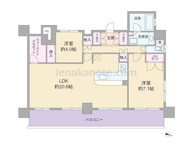 専有面積71.28平米の2LDK。L字型のLDKは、ダイニングスペースとリビングスペースに空間を用途ごとにはっきり分けて使うことが出来ます。収納が各所にあるのもポイント。キッチンはリビング・ダイニングを見渡せるI型の対面タイプ。トイレへは...