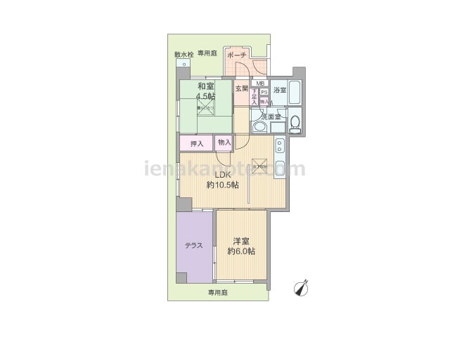 専有面積46.17平米の2LDK。玄関前に専用ポーチがあり、専用庭も付いた戸建感覚のプラン。LDK約10.5帖に収納スペースがあり、キッチンはI型のウォールタイプ。洋室約6.0帖には収納スペースがありませんが、引き戸を開放すればLDK約1...