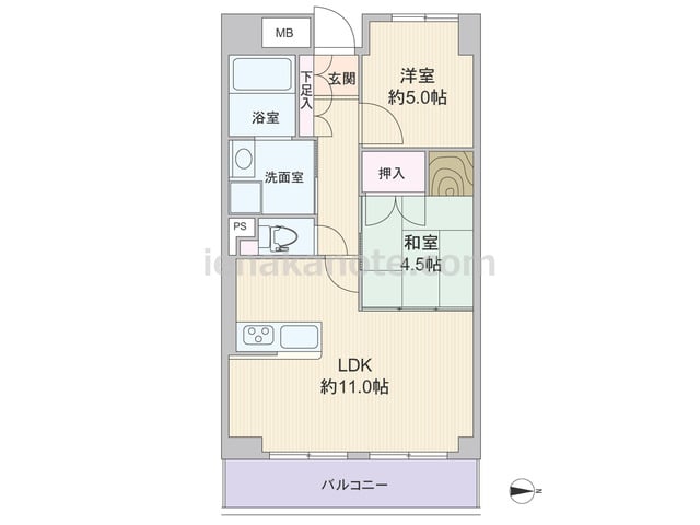 専有面積47.72平米の2LDK。LDKは約11.0帖、対面カウンタータイプのキッチンは、料理をしながら家族とコミュニケーションが取りやすい配置。和室4.5帖は2カ所から出入りが可能。洋室約5.0帖には収納スペースが無いため、家具を置くな...