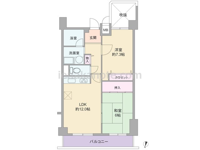 専有面積54平米の2LDK。全部屋6帖以上のゆとりがあるプラン。共用廊下に直接面する窓が無いため、プライバシーを保ちやすい造りです。LDKは約12.0帖、キッチンはI型の壁付け・オープンタイプの仕様。各居室と室内廊下に収納が確保されていま...
