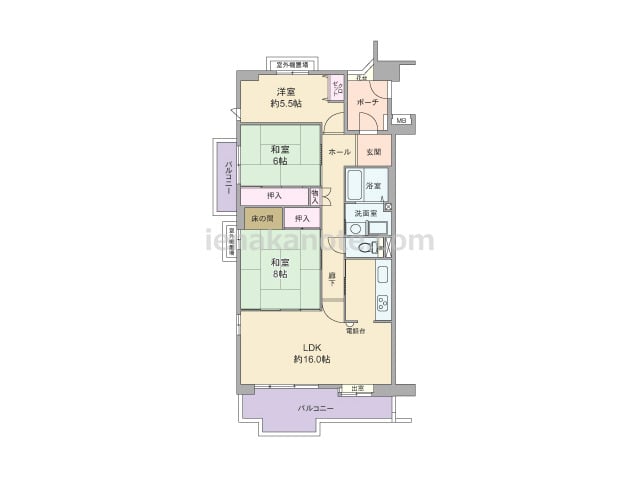 専有面積74.52平米の3LDK。共用廊下に直接面する住居の窓が無い、プライバシーが確保されたプラン。キッチンは壁付け・オープンタイプ。LDKは約14.0帖大の広さと出入り口が2カ所あります。洋室約5.0帖には収納スペースが無いため収納家...