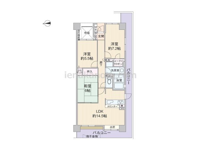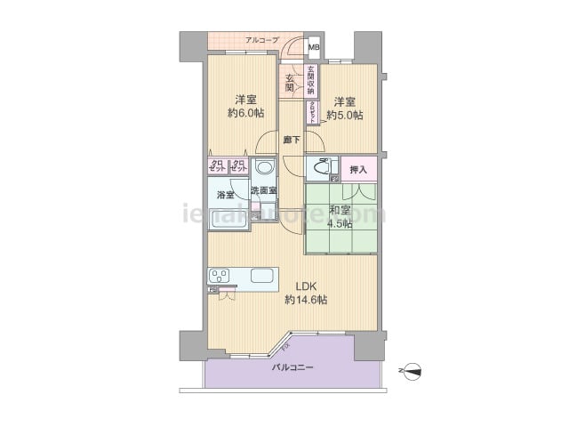 専有面積64.1平米の3LDK。玄関前にはアルコーブが設けられています。LDK約14.6帖にはコーナーサッシが用いられており、キッチンは料理中も家族と会話を楽しめる対面カウンタータイプ。和室4.5帖はLDKと室内廊下の2カ所から出入りが可...