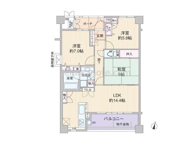 専有面積75.26平米の3LDK。玄関前に専用ポーチがある、プライバシーに配慮されたプラン。LDK約14.4帖にはTEL台があり、対面キッチンの背面には便利な物入もあります。和室6帖は来客時には客間にしたり、LDK側の襖を開放して約19....