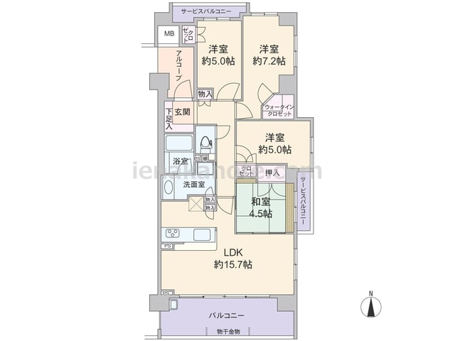 専有面積84.61平米の4LDK。玄関前にはアルコーブがあり、居室の窓が共用廊下に直接面していない、プライバシーを確保したプラン。LDK約15.7帖には和室4.5帖が接しており、室内廊下からも出入りが可能。キッチンは料理中も家族と会話を楽...
