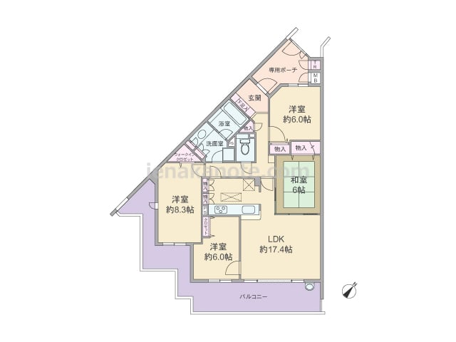 専有面積94.3平米の4LDK。玄関前に専用ポーチがあり、ポーチ内にトランクルーム付き。居室の窓が共用廊下に面していおらず、玄関先から室内を直接見通せない造りでプライバシーを保ちやすいプランです。キッチンは対面カウンタータイプ。キッチン横...