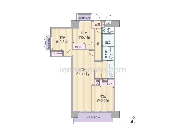 専有面積74.30平米の3LDK。玄関先から室内を直接見通せない造りでプライバシーを確保。LDKは約18.1帖大の広さがあり、生活感の出やすいキッチンは奥まって配置されているため、リビング・ダイニングはくつろぎの空間を演出できます。洋室約...