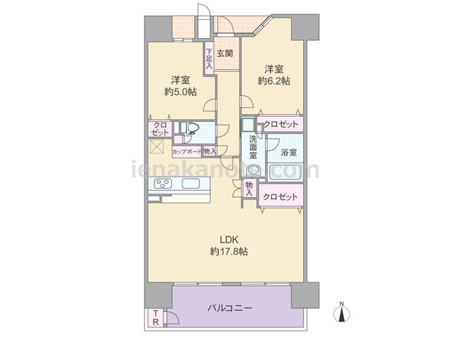 専有面積65.62平米の2LDK。共用廊下と玄関・居室の間にアルコーブが設けられています。LDKは約17.8帖、キッチンはリビング全体を見渡せる対面カウンタータイプ。収納スペースが豊富にあり、バルコニーのトランクルームはゴルフバッグやガー...