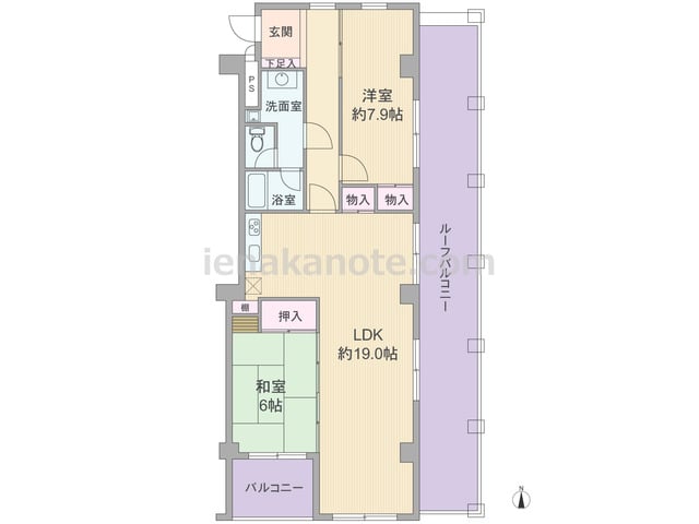 専有面積81.24平米の2LDK。開放的なルーフバルコニー付きプラン。どの部屋も6帖以上のゆとりがあり、LDK約19.0帖と続き間の和室の引き戸を開放すれば、約20.5帖大の一室としても利用出来ます。キッチンは空間を有効利用できるI型の壁...