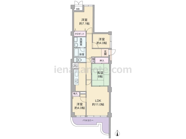 専有面積71.42平米の3LDK。廊下の短い専有面積を有効に利用したプラン。キッチンは壁付けのオープンタイプ。各部屋に収納スペース付き。LDKと2室が続き間の為、家族のコミュニケーションの機会が増えます。