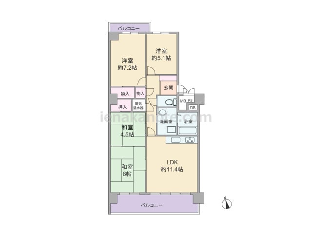 専有面積86.42平米の4LDK。センターインのプラン。LDKと和室が続き間で、一つの空間としても使用出来ます。玄関横の洋室約4.0帖には収納が無いため、場合により家具の配置が必要です。