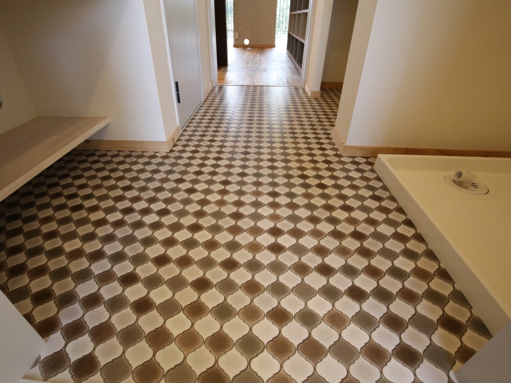 床はランタン型のクッションフロア(サンゲツ・HM2067)。巾木は構造用合板を加工したものです。