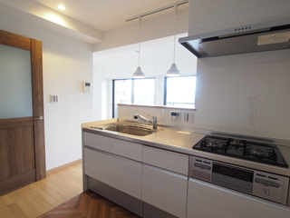 • キッチンスペース(6) 全体の様子 壁材 レンジフード 床材 ペンダントライト ガスコンロ