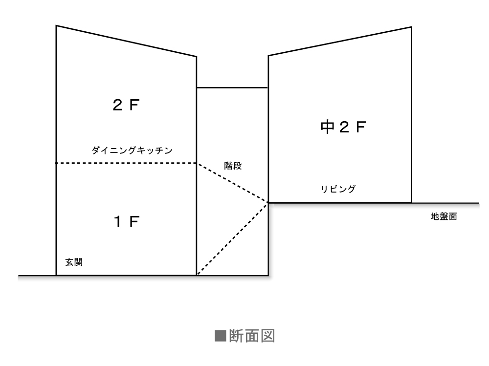 敷地内にある高低差をうまく利用した、スキップフロアの家です。