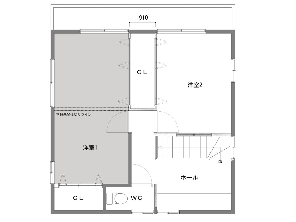 2部屋に分けた時に困らないように、クロゼットを追加しています。(中央上)