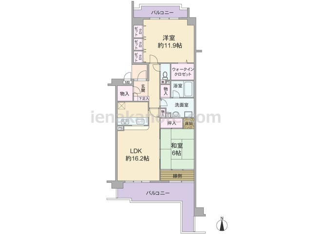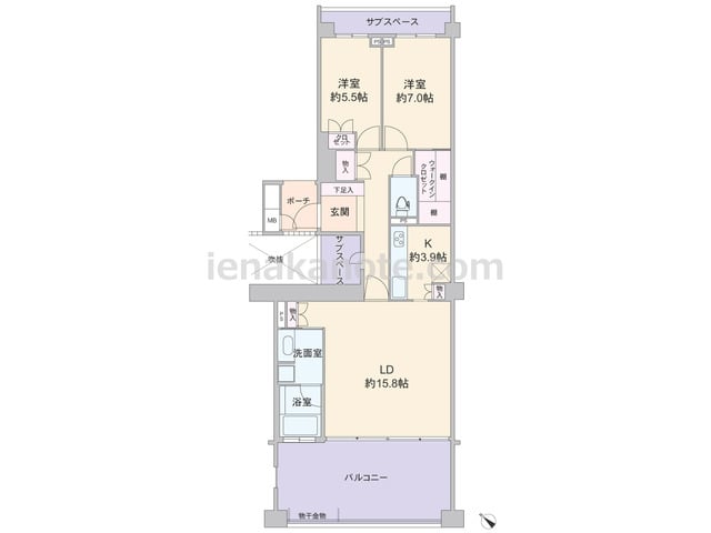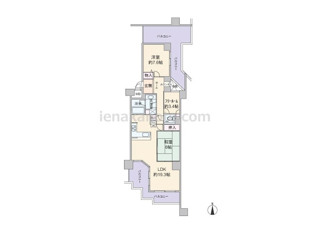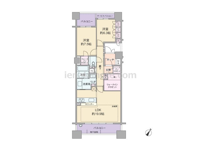 専有面積89.16平米の2LDK。センターインのプランで、南北両面にバルコニー付き。LDKはゆとりの約23.8帖大。キッチンはアイランド型になっており、すぐ横に物入付き。主寝室は約7帖の広さがあります。