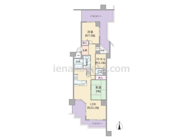 専有面積80.43平米の2SLDK。南北両面にバルコニーがあるセンターインのプラン。玄関正面には吹抜に面したカウンターがあります。LDKは約20.2帖大とゆとりあり、キッチンはL字型の対面式。和室6帖はくつろいだり、小さい子供の遊び場・お...